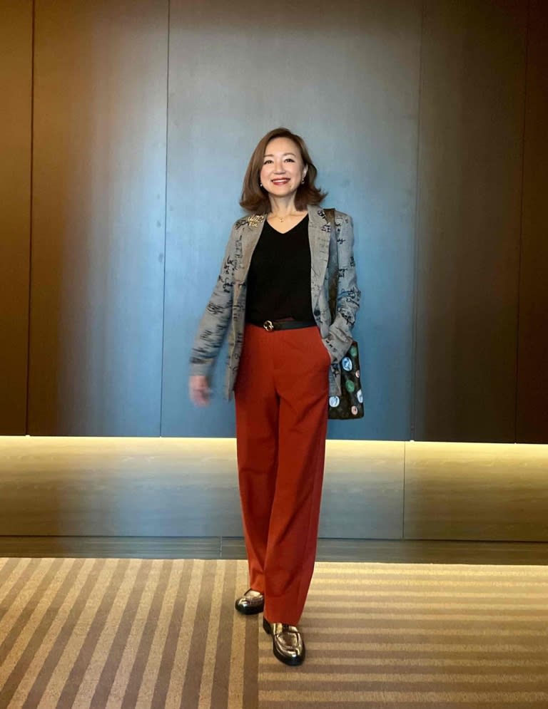 The fashion of the day was a foreign letter pattern jacket with orange pants.