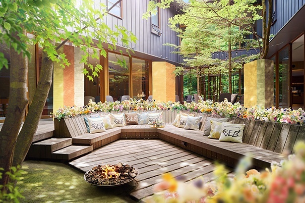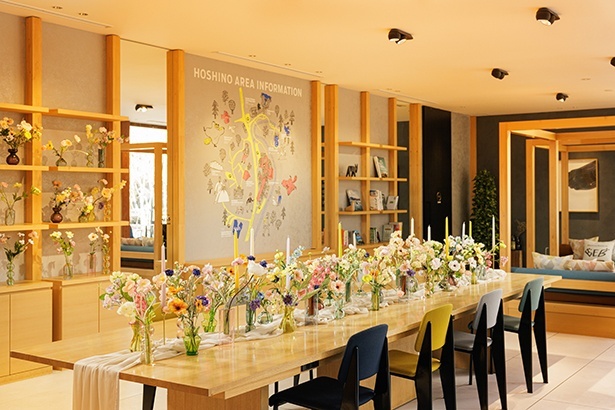 The "Flower Terrace," decorated with colorful flowers, has newly opened in the public space "TAMARIBA." By using various colored flowers that evoke the gardens of Karuizawa, it creates a vibrant and bright space where you want to take photos no matter which part you capture. As a 24-hour public space, you can enjoy it anytime, whether having breakfast, spreading out takeout food, or enjoying drinks at night. Additionally, an aroma diffuser inspired by a flower garden has been installed inside the building, creating an environment where you can feel the arrival of spring through both visual and olfactory senses.