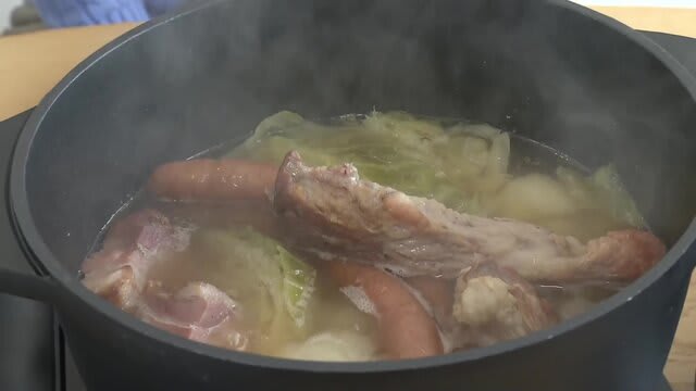 The pot-au-feu made with plenty of the brand pork from Togoshi, "Tsumugi Pork," is a luxurious dish featuring Tsumugi Pork exclusively, including sausages, bacon, and spare ribs.