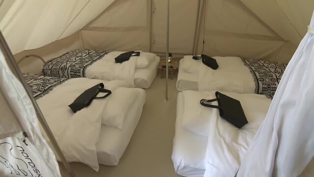 "Classroom Tent Room" has four beds inside a tent installed indoors.