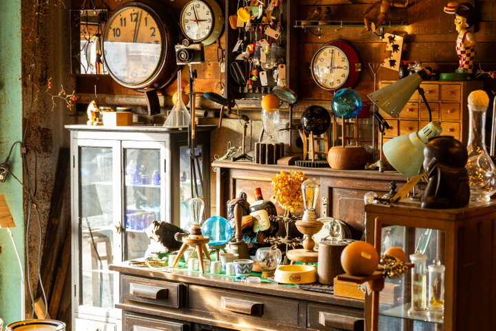 "Kudougu Donguri (Full Dōgu Donguri)" is located in Osaka and Kyoto. It is situated in the city of Takatsuki, between Osaka and Kyoto. In a space that was originally a lumber warehouse, various antique items such as retro furniture, appliances, lighting, glassware, tableware, and clocks are neatly displayed. Welcoming customers are the cat manager Vivi-chan and the cat part-time worker Coco-chan. The store is filled with relaxing spots where they enjoy themselves at their favorite places, providing a soothing atmosphere.