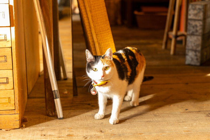 Vivi-chan, the cat manager living with the couple owners, is 4 years old. She spends her time lounging on top of the counter where the cash register is, or in sunny spots, keeping an eye on customers.