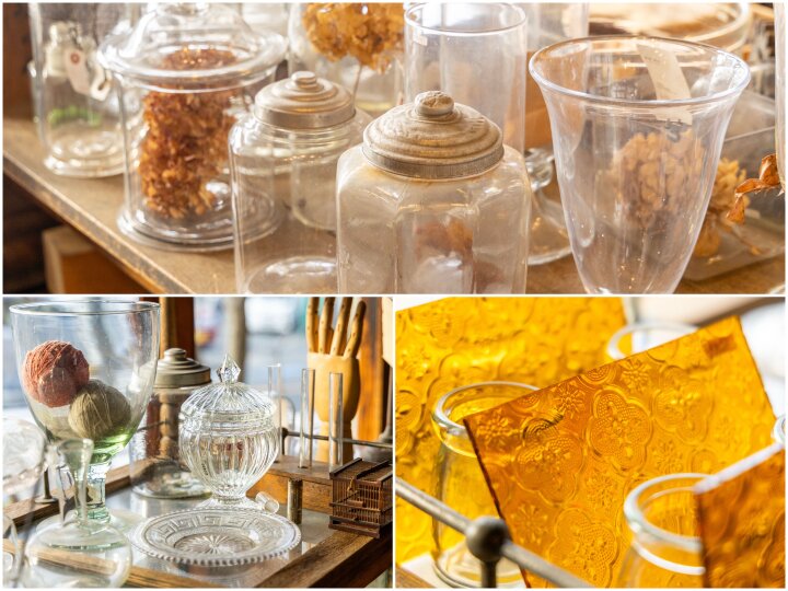 Numerous glass products, such as plates that can be used as coasters or flat dishes, storage bottles that make you want to create your own syrup or homemade alcohol, and glasses that look like pictures just by being displayed. Traditional glass products have bubbles and variations that are not found in mass-produced items, giving them a warm and appealing texture.