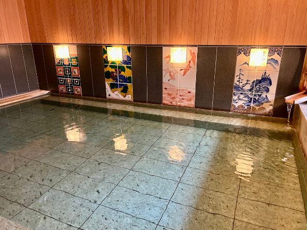 The large bath is adorned with Kiyomizu-yaki art panels, expressing the four seasons in four different styles. It's impressive to have the time to "gaze at crafts" while soaking in the hot spring.