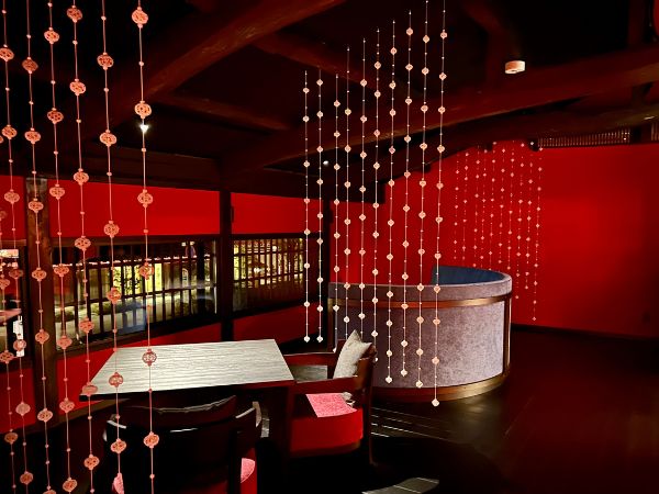 The "Bengara Lounge" located in the traditional architecture building is a "place for adults" where you can enjoy sake and snacks together with traditional crafts such as Kiyomizu-yaki and Yamakato Urushi. Outside the window, you can see the night view of the hot spring town and willow trees. A quiet time flows gently.