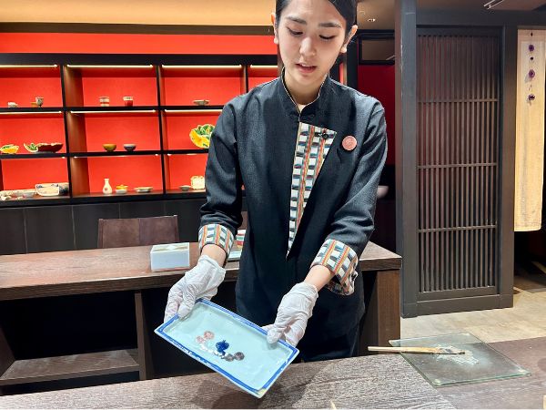 One of the charms at the entrance of the lounge is being able to choose your preferred sake vessel or dish from a selection of Kiyomizu-yaki, Yamakato Urushi, and other ceramics. It's strange how the taste of the same local sake seems to change when the vessel changes.